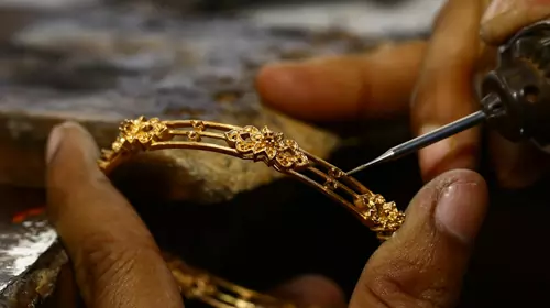 Polishing offers a neat finish and enhances the value of a piece. Polishing involves three steps, tumbling, pre polishing, and ultra-cleaning. Jewellery pieces with diamonds require pre polishing before the diamond is set. This is because once the diamonds are set the area below the diamond portion cannot be polished and may affect the shine of the diamond. Polishing can be done either by hand or by machine. If the jewellery is hand polished, then the craftsman uses different tools like solid buff, soft buff, hair buff, coin buff, single line ball buff, green rouse for shine, platinum polishing rouse, black lustre for removing casting/filling layers, red rouse to impart shine and white lustre to remove roughness.