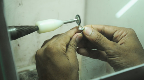 Once the raw casting is clipped off from the casting tree, it has a tiny nub leftover at a place where the gold piece was attached to the sprue. The polisher grinds off this nub using the motorized grinding machine, which acts as an abrasive to smooth the surface of the gold piece/jewellery.